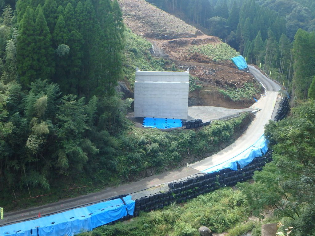 本工事は、中九州道の朝地?竹田間の橋梁下部工事及びそれに伴う工事用道路工事でした。