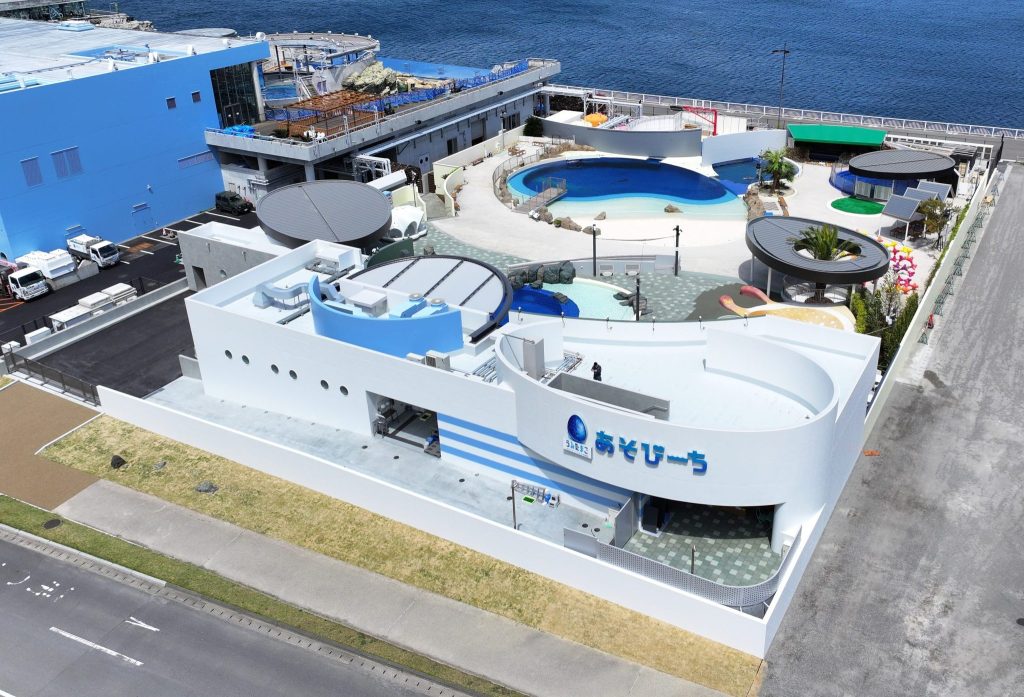 本工事は、マリーンパレス創立60周年・うみたまご開業20周年記念事業として、あそびーちの拡張工事を施工いたしました。 新しいあそびーちの魅力である動物たちと同じ空間でのんびり過ごせる施設作りに、御施主様・スタッフ様をはじめ、設計事務所様、協力会社様のご協力のもと無事竣工することができ、心より感謝申し上げます。拡張施設内の『岩のプール』や、新遊具『クラゲ・グラウンド』にて動物たちと一緒に楽しく過ごせる時間を是非体感していただければと思います。